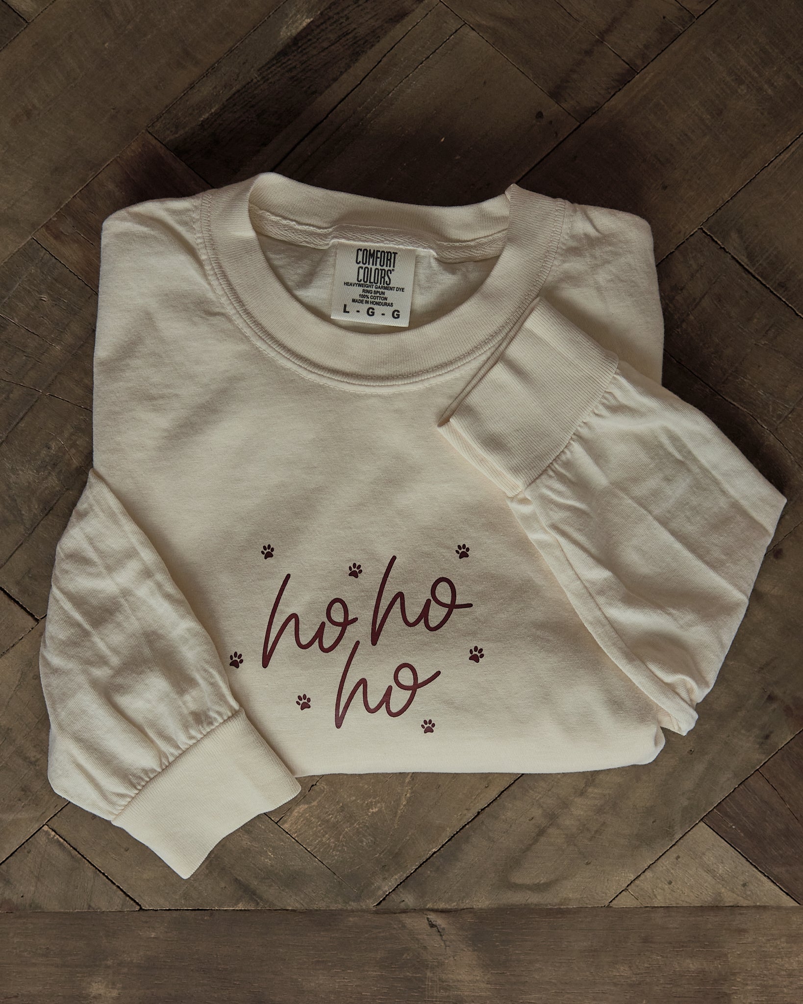 Ho Ho Ho long sleeve is the perfect addition to your closet for the holiday season! The design is truly custom as it's my handwriting and the small paws are super minimal. It's giving little snowflakes and I'm obsessed. Hope you love it!